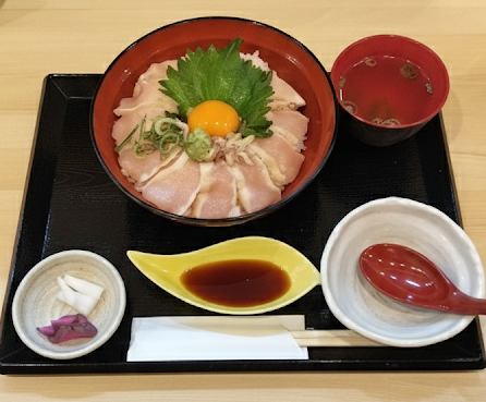 丼が運ばれてきた瞬間、まず目を奪われたのは艶やかに盛りつけられた鳥刺し。鮮度の高さが見た目からも伝わるようで、表面はほんのり光沢を帯び、しっとりとした質感が際立っています。その中央には、鮮やかなオレンジ色の卵黄がひとつだけ、堂々と鎮座。まるで宝石のように輝き、丼全体を引き締めています。